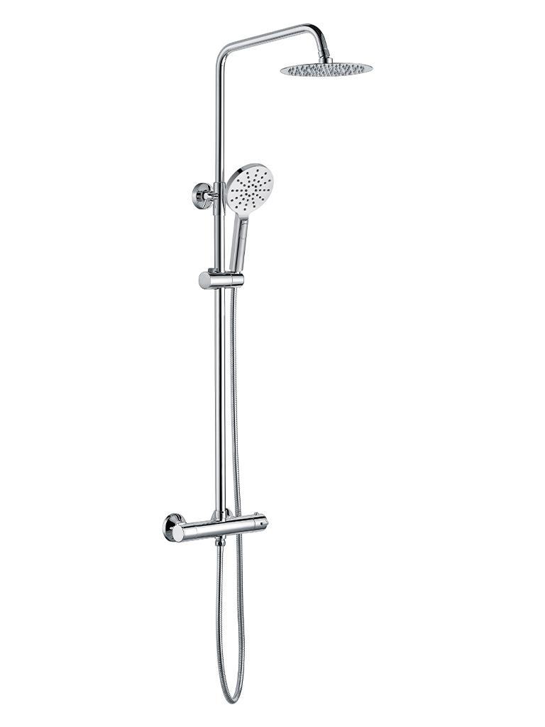 Adjustable handset holder 200mm ultra-thin solid metal fixed shower head Fully thermostatic valve Includes diverter Easy clean rubber nozzles on shower head and handset Built-in 38 degrees anti-scald temperature control